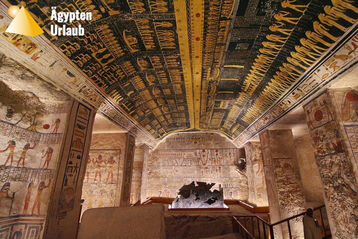 Während der geführten Besichtigung betreten Sie ausgewählte Königsgräber, deren Wände mit farbintensiven Szenen aus dem Totenbuch, dem Amduat und anderen jenseitigen Texten geschmückt sind. Die Reiseleitung erklärt die symbolische Bedeutung dieser Darstellungen, die den Weg der Pharaonen ins Jenseits beschreiben. Besonders faszinierend ist die erstaunliche Farbqualität der Reliefs, die trotz ihres Alters von mehreren Jahrtausenden noch immer lebendig wirken. Jeder Raum erzählt eine eigene Geschichte von Macht, Glauben und dem Streben nach Unsterblichkeit.
